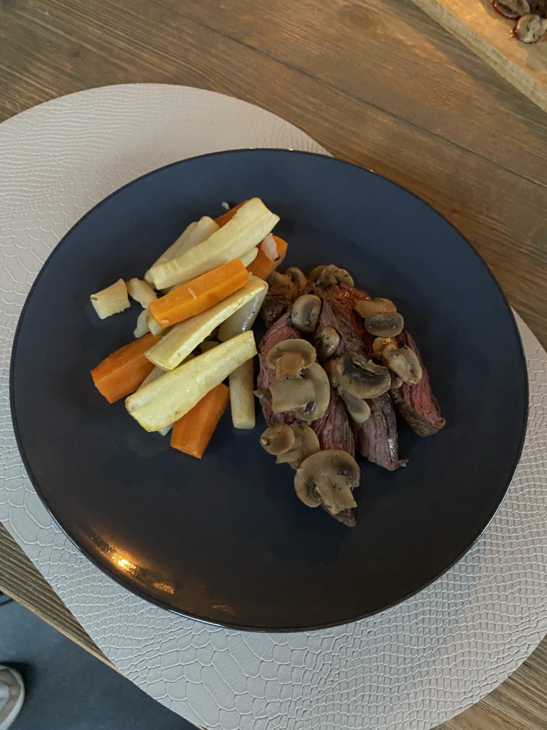- Snijd de bavette in dunne plakjes, leg op een schaal en verdeel de paddenstoelen erover.