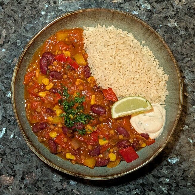 - Serveer de chili met de rijst en de kwarkdressing.