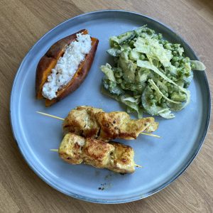 - Serveer de kipspiesjes, aardappel en salade op een bord!